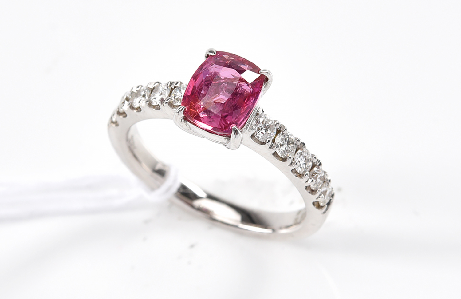 A PADPARADSCHA SAPPHIRE AND DIAMOND RING, SAPPHIRE ESTIMATED WEIGHT 1.57CTS IN 18CT WHITE GOLD, RING SIZE L.