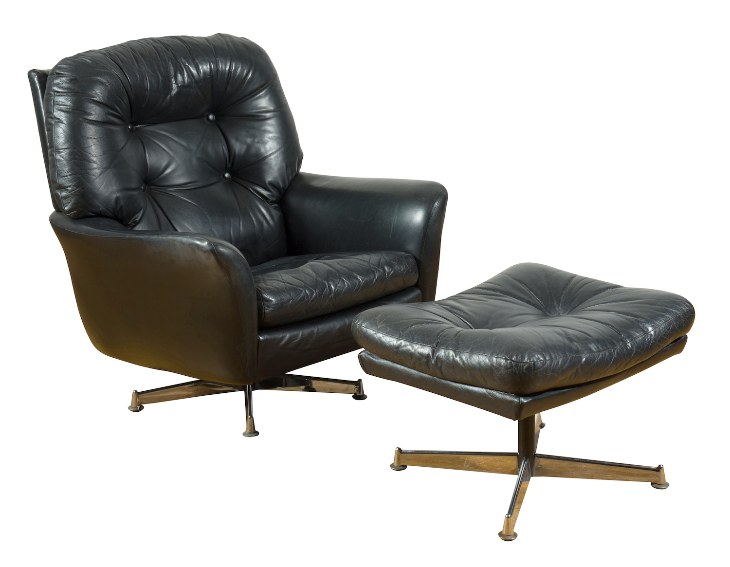Chair and footstool structurally sound. Leather is nicely worn with some crackling to edges. Minor scratches to base. Overall good condition consistent with age.