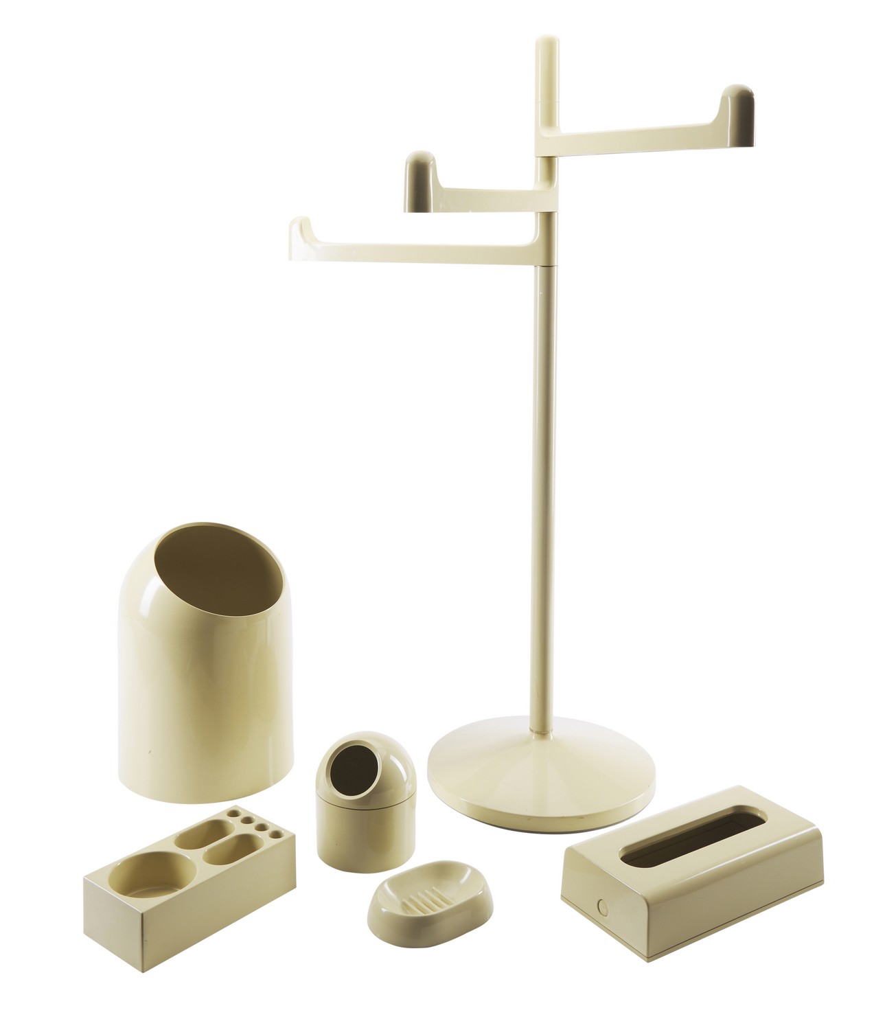 Comprising free standing towel rack, waste bin, soap dish, cotton ball holder and mountable tissue box cover
