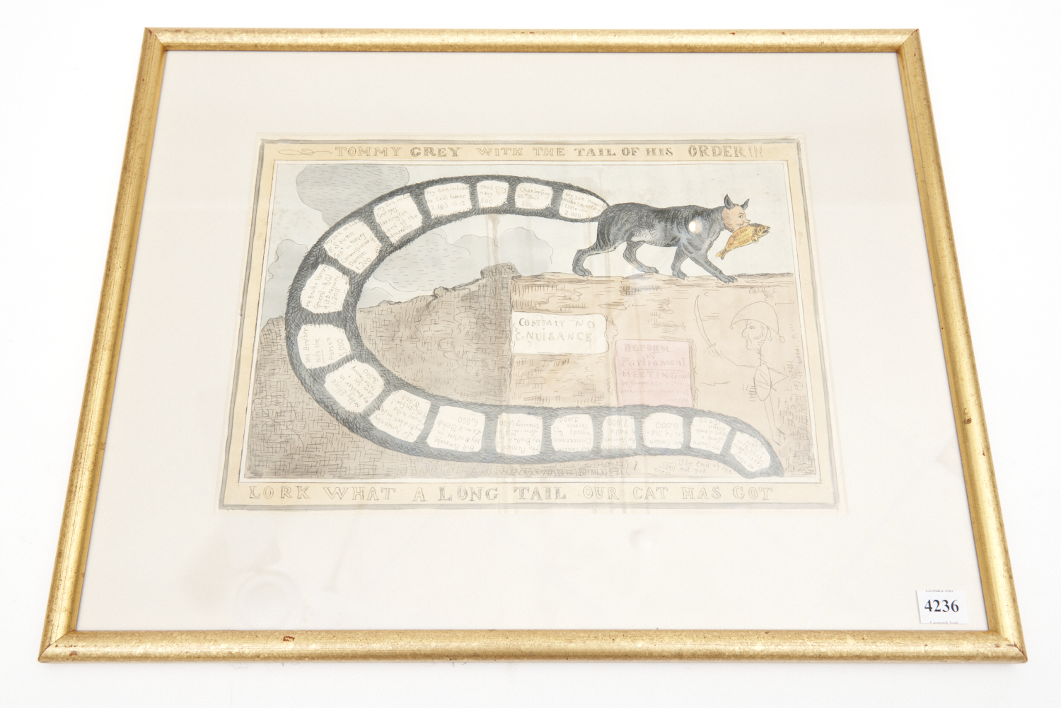 A FRAMED COLOURED ETCHING TITLED "TOMMY GREY WITH THE TAIL OF HIS ORDER"