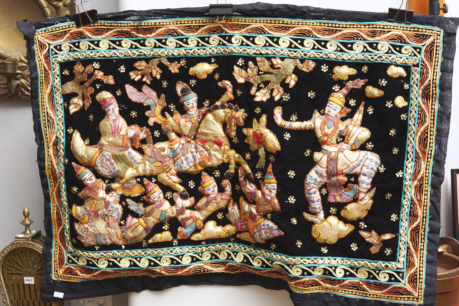AN ANTIQUE THAI KALAGA EMBROIDERED WALL HANGING