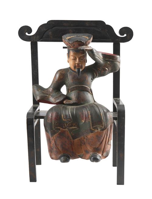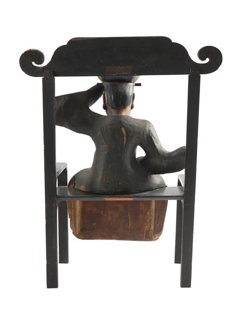 Losses to polychrome decoration, old repairs. Chair repaired to one arm.