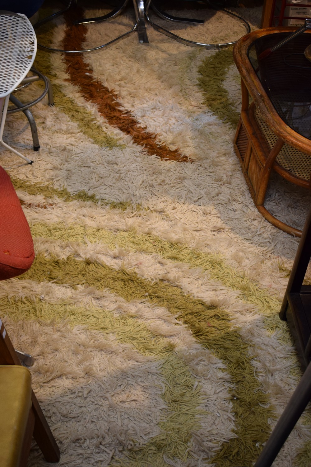 A MID-CENTURY SHAGPILE RUG IN EARTH AND CREAM TONES, ALL PURE WOOL ON WOOL WITH NATURAL DYES