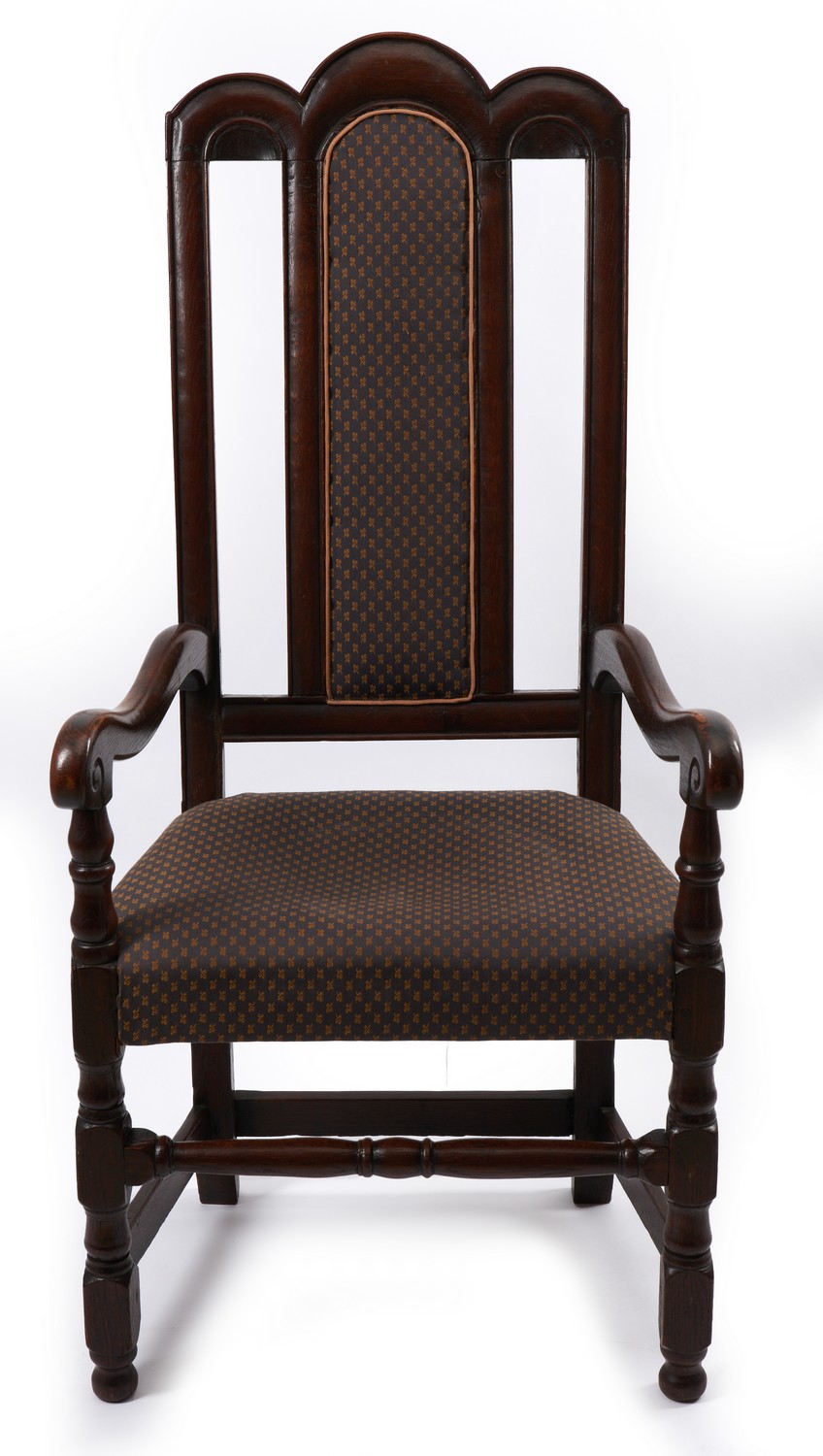The crest rail dividing into three arches with a central upholstered splat, above out swept arms terminating in scrolls, the upholstered seat raised upon turned front legs and stretchers