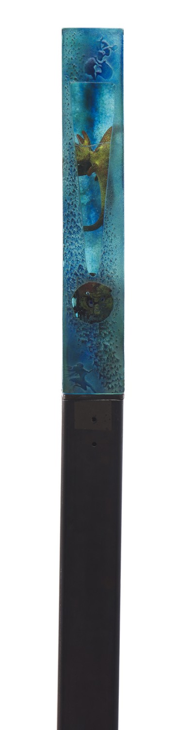 Structurally sound. Some rusting and sticky tape marks to steel base. No chips or fractures to glass sculpture. Light is in working order. Overall very good condition consistent with age.