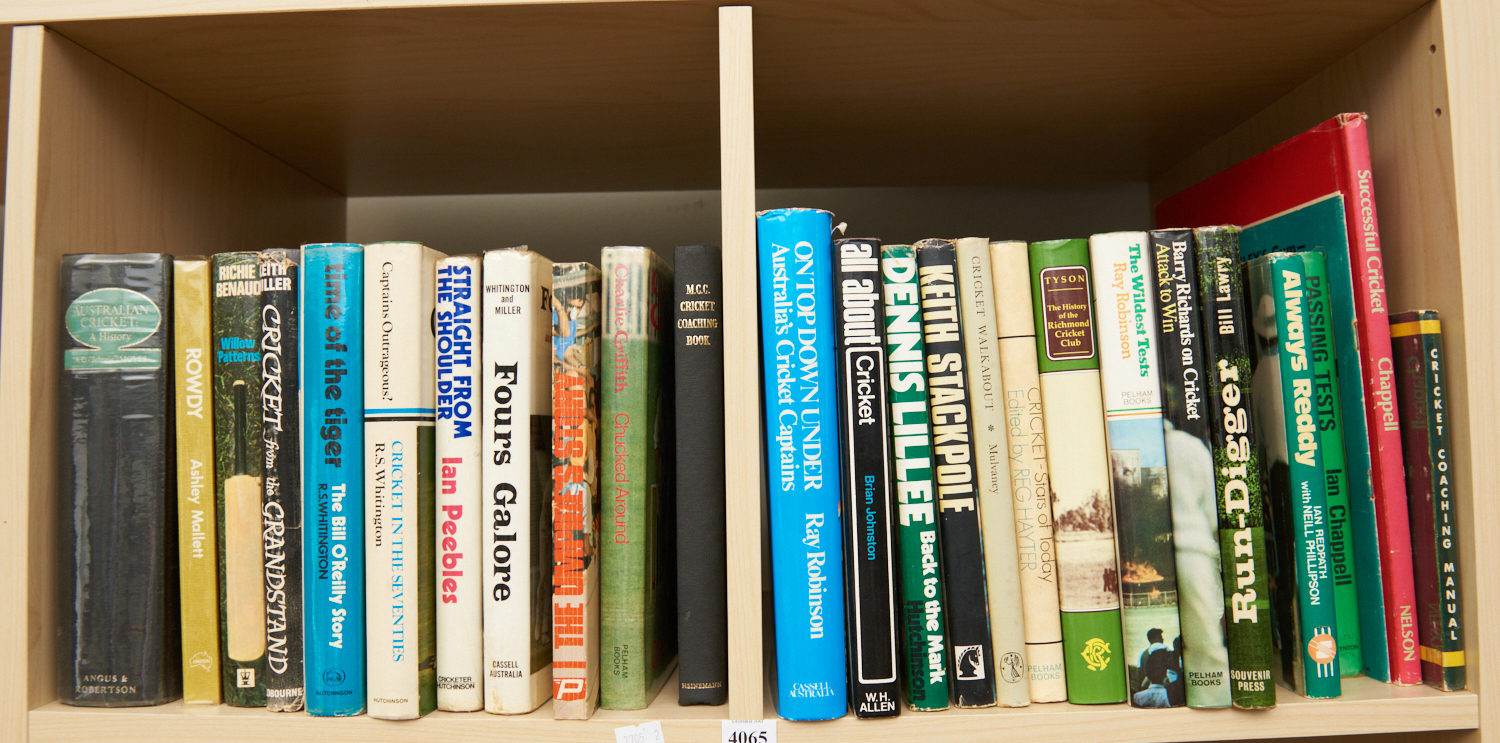 A SHELF OF CRICKET RELATED BOOKS INCLUDING AUSTRALIAN CRICKET A HISTORY, A.G MOYES AND MCC CRICKET COACHING BOOK ETC