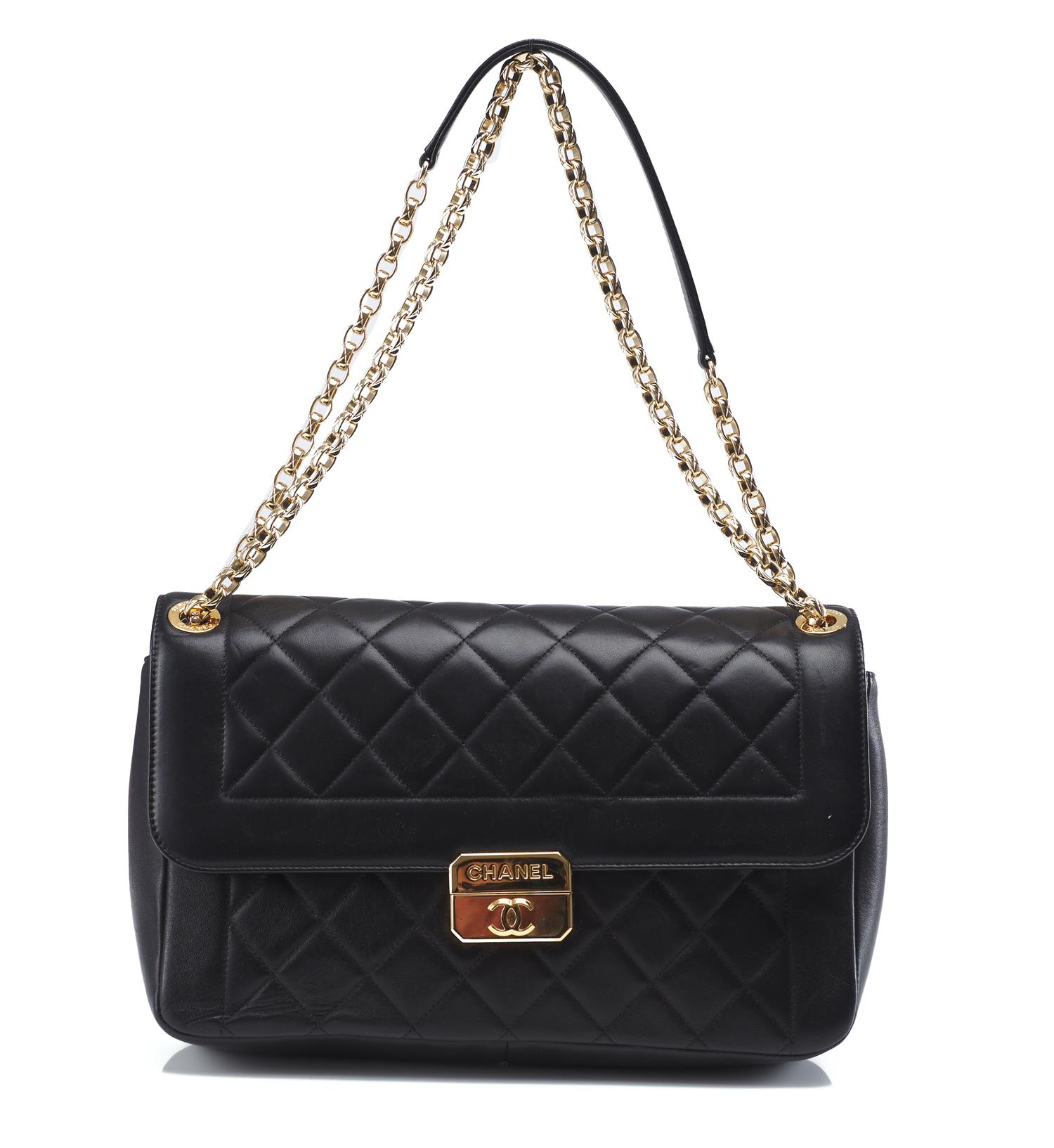 Styled in black quilted leather with gold metal hardware and conforming chain shoulder strap, 28 x 20 x 7cm.