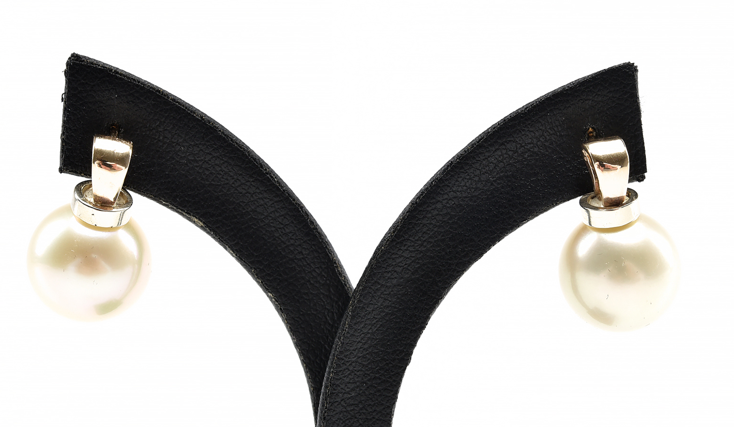 A PAIR OF SOUTH SEA PEARL (12.7MM) EARRINGS IN TWO TONE 9CT GOLD