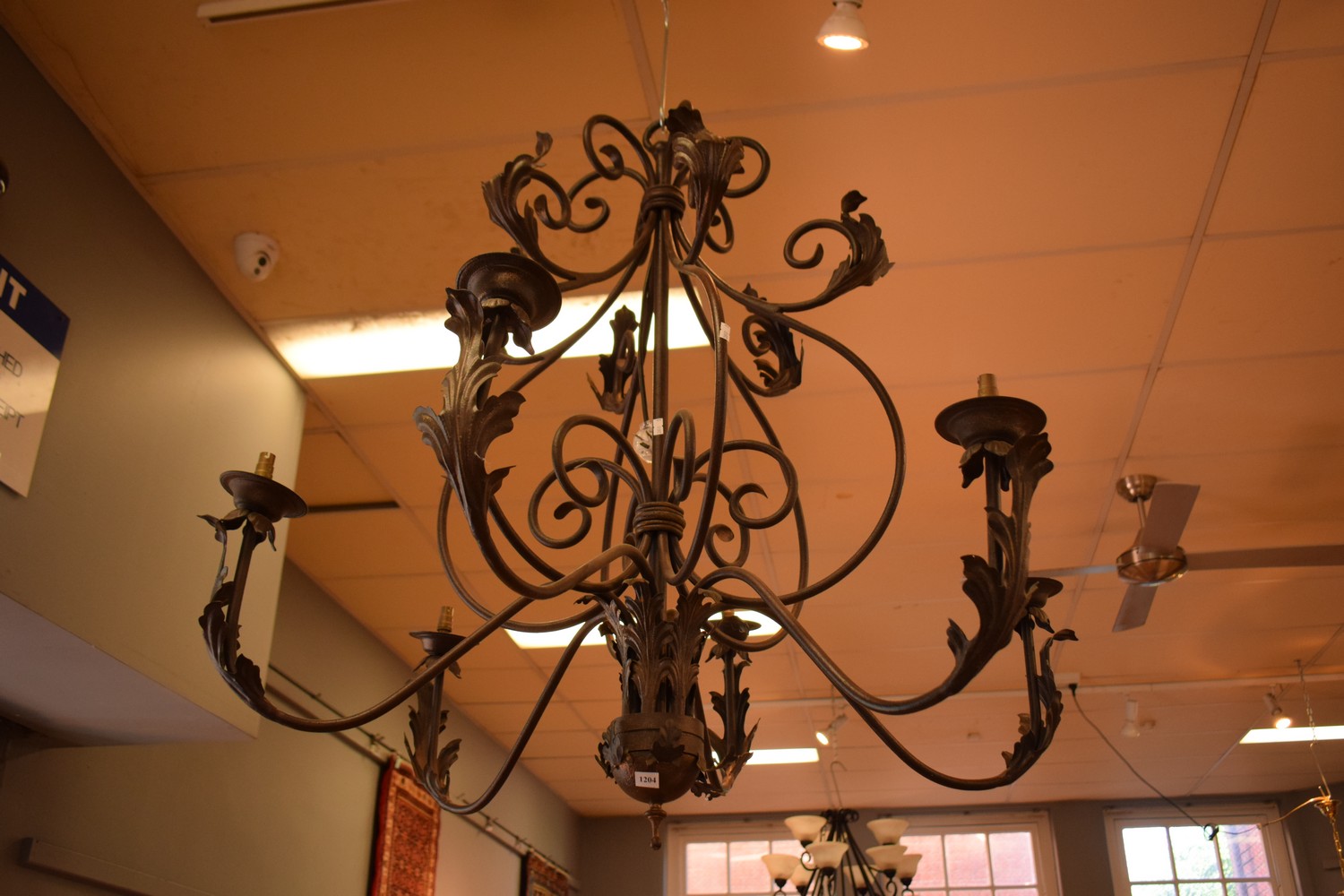 A LARGE CAST IRON SIX BRANCH CHANDELIER
