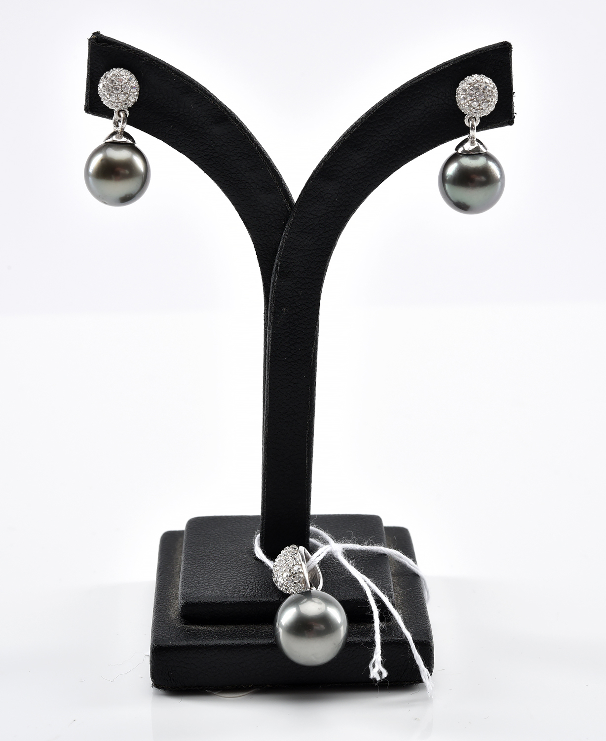 A TAHITIAN PEARL AND CUBIC ZIRCONIA JEWELLERY SUITE, COMPRISING A PAIR OF EARRINGS AND A PENDANT IN STERLING SILVER