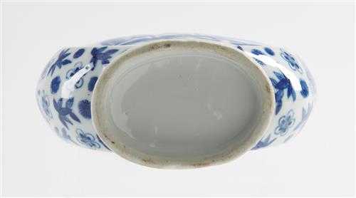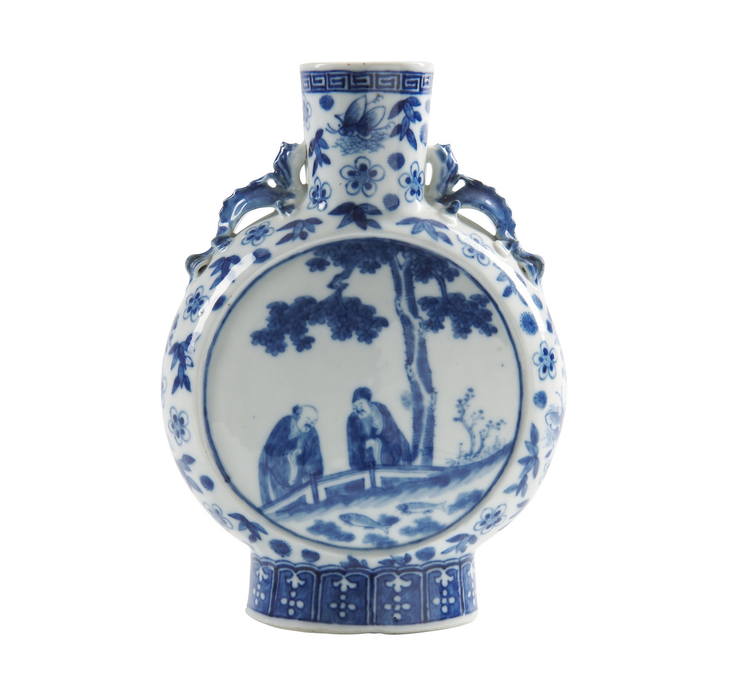 Decorated to each side with a scholar viewing a fish pond, dragon handles to the shoulder.