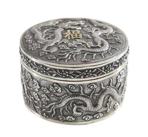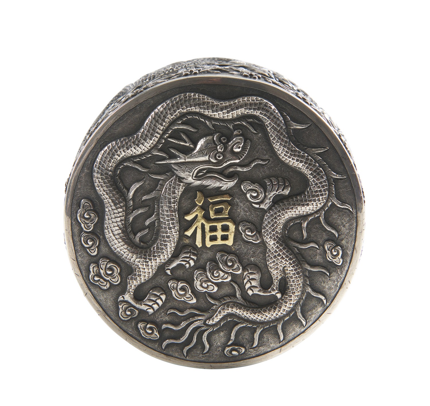 Decorated with repousse dragons chasing flaming pearls amidst clouds, with a gilt character to the centre of the lid.