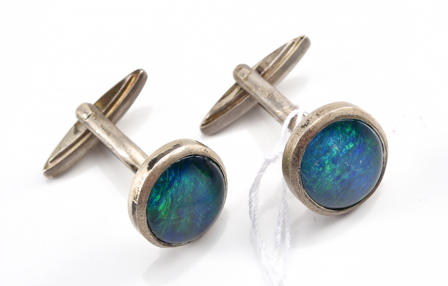 A PAIR OF AUSTRALIAN OPAL CUFFLINKS BY GILLIAN HILLMAN IN STERLING SILVER