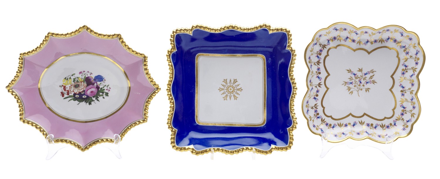 The first shaped with a faceted and lobed edge, decorated with a central bouquet of flowers, attributed to the painter Samuel Astles, enclosed by a pink ground. Impressed Flight Barr & Barr mark to reverse. The second square in form with a lobed edge, decorated with gilt-blue repeating flower motifs. Impressed Flight Barr & Barr mark to reverse. The third square in form with shaped corners, decorated with a blue ground and gilt highlights. Impressed Flight Barr & Barr mark to reverse.