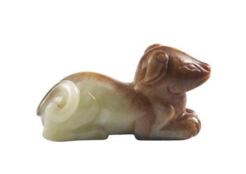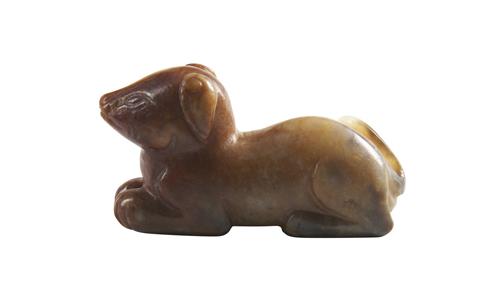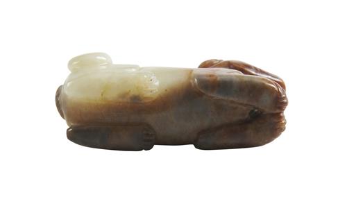 Modelled as a recumbent dog in celadon jade exhibiting russet skin to one side.