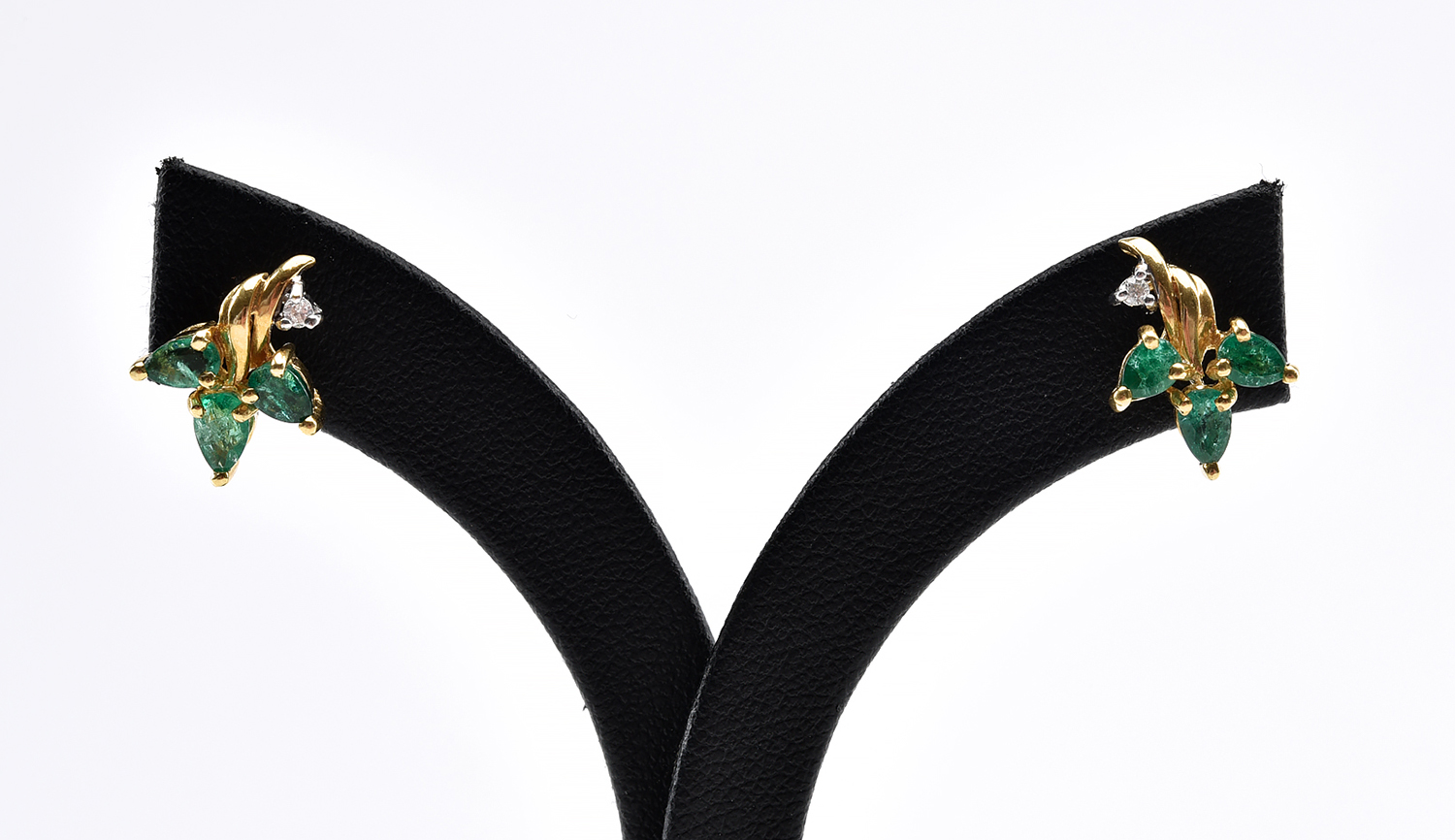 A PAIR OF EMERALD AND DIAMOND EARRINGS IN 18CT GOLD, 2.6 GRAMS