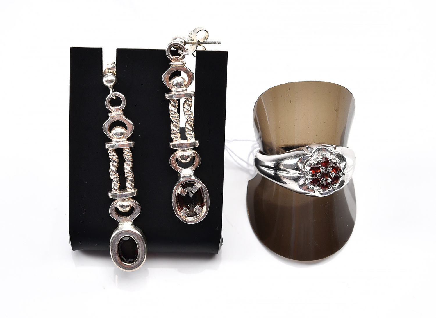 A PAIR OF GARNET EARRINGS TOGETHER WITH A GARNET RING IN STERLING SILVER