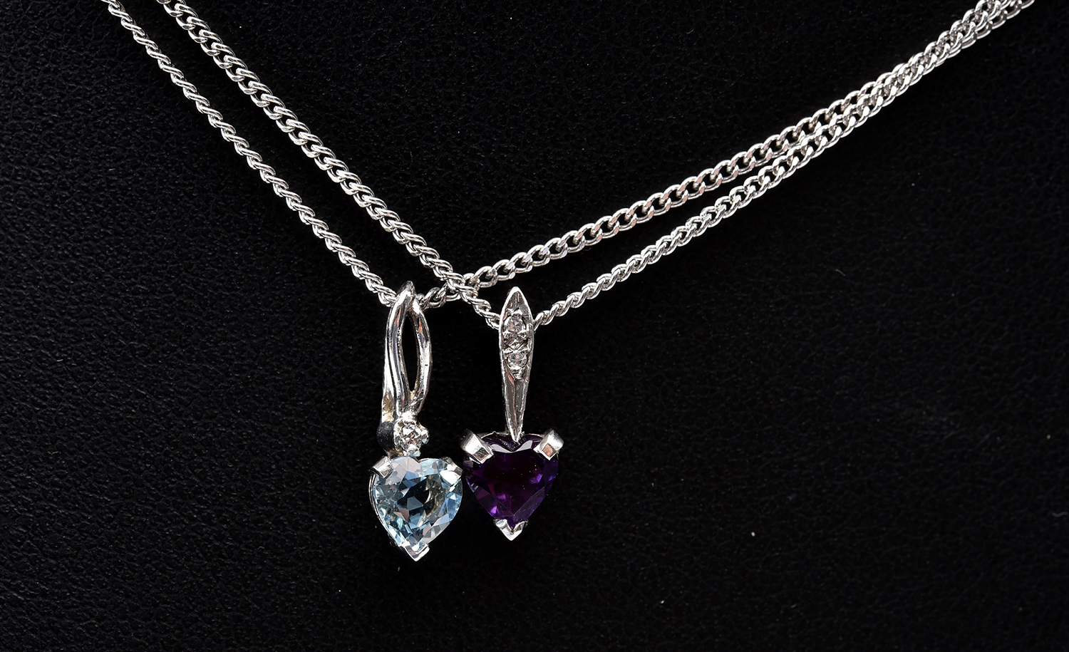 TWO HEART PENDANTS (AMETHYST AND AQUAMARINE) WITH FINE DIAMOND DETAIL IN 9CT WHITE GOLD (DISPLAY CHAINS)