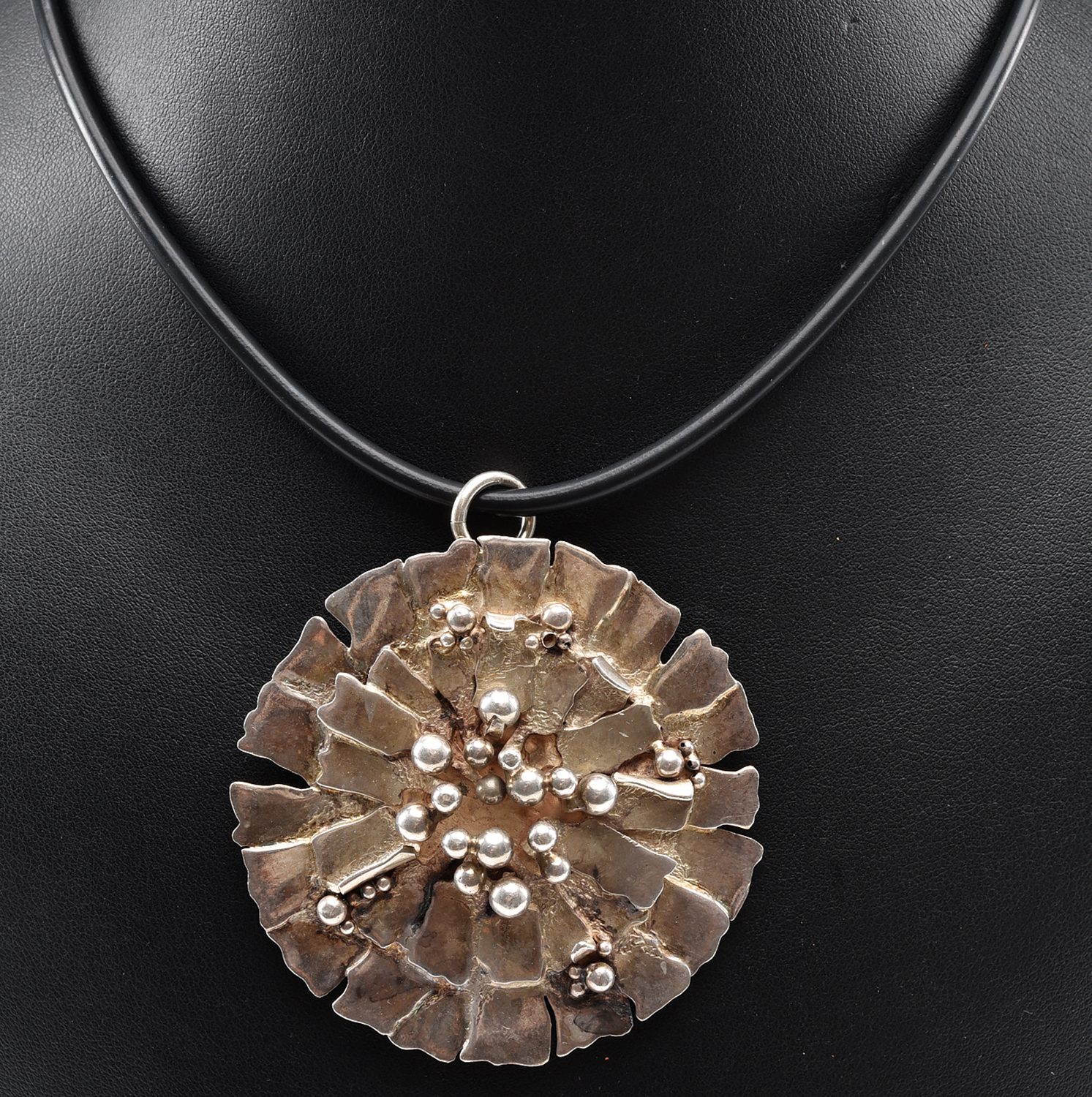 A HANDCRAFTED BROOCH/PENDANT IN STERLING SILVER TO A NEOPRENE CORD