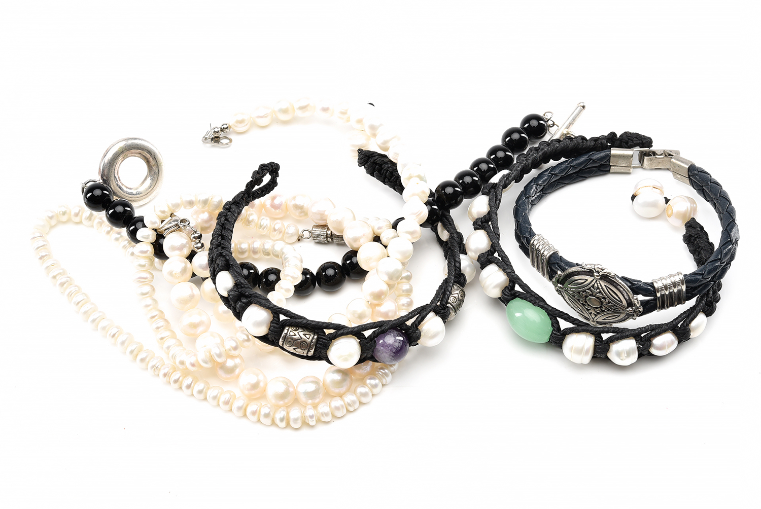 A COLLECTION OF FRESHWATER PEARL JEWELLERY, INCLUDING A NECKLACE AND BRACELETS, SOME IN STERLING SILVER