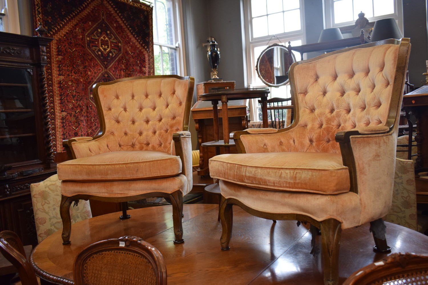 A PAIR OF BIRCH FRAMED BUTTON BACK ARMCHAIRS IN GOLD UPHOLSTERY