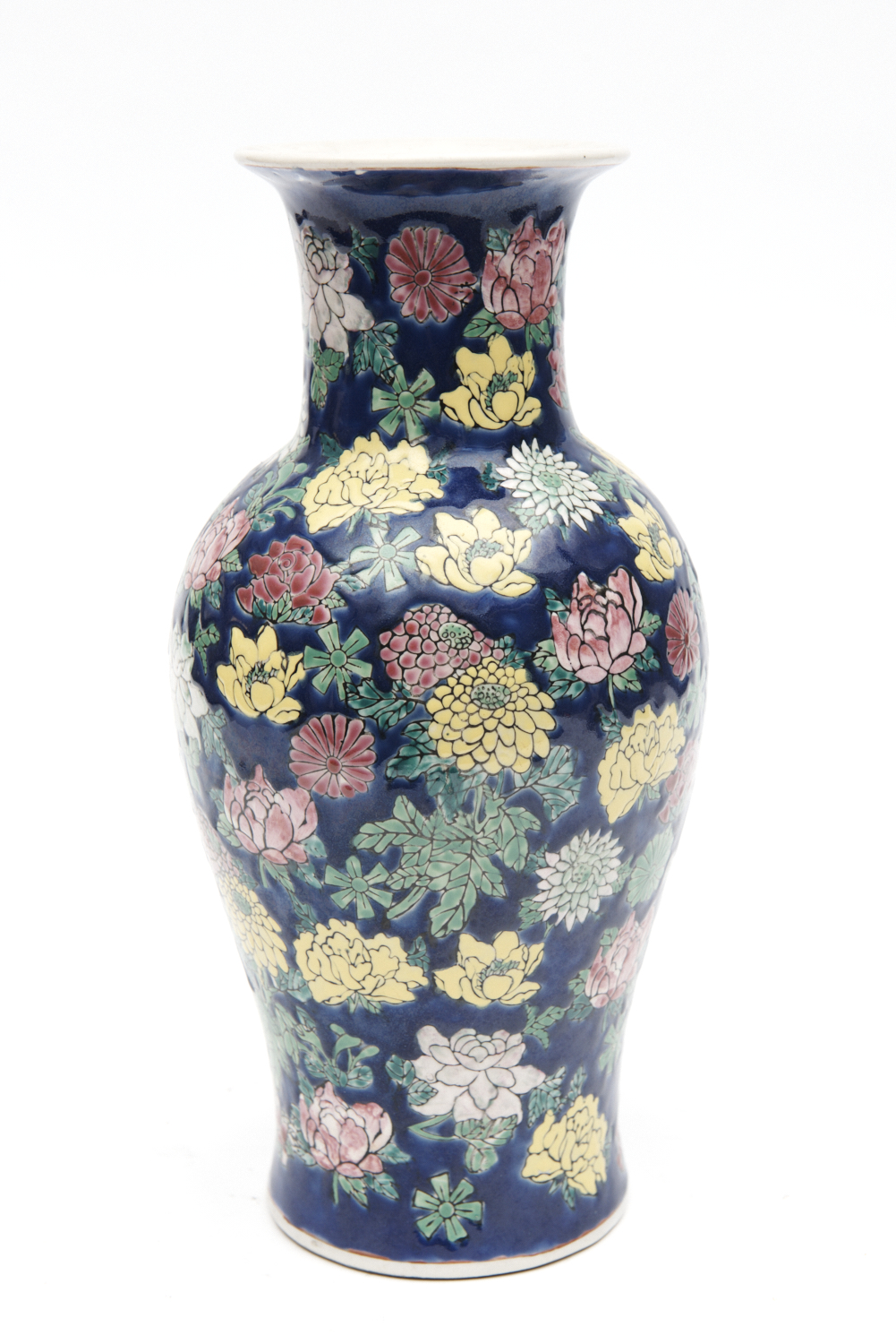 A CHINESE FLORAL VASE, MARK TO BASE, (A/F, HAIRLINE), 31 CM HIGH