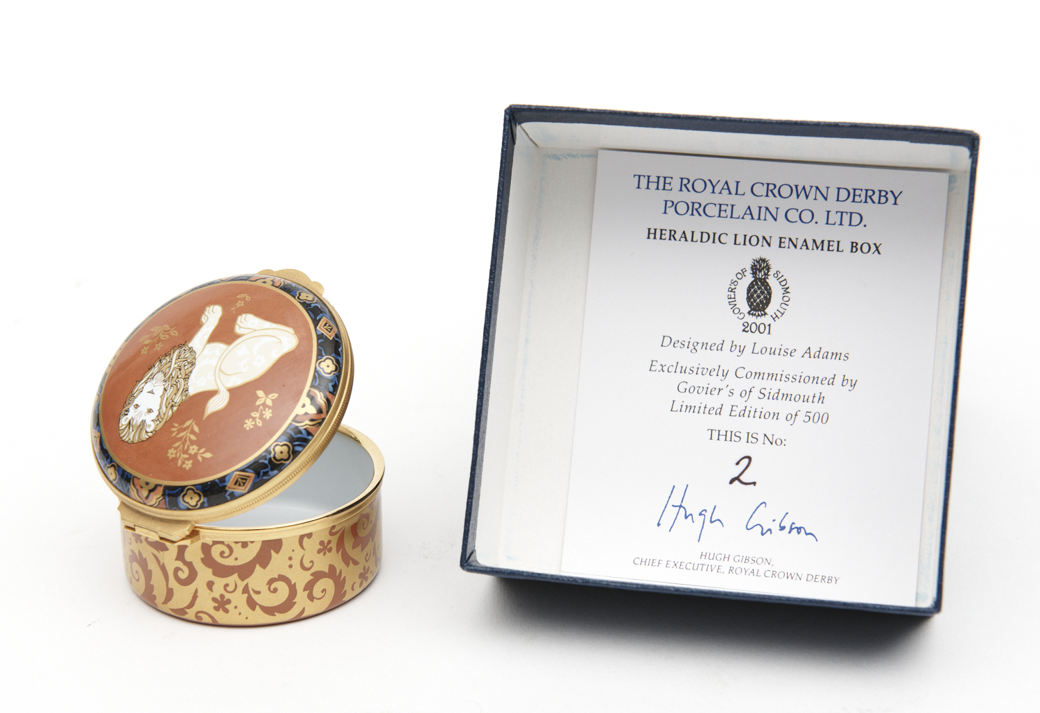 A LIMITED EDITION ROYAL CROWN DERBY HERALDIC LION ENAMEL BOX, BOXED, WITH CERTIFICATION CARD, NO. 2/500