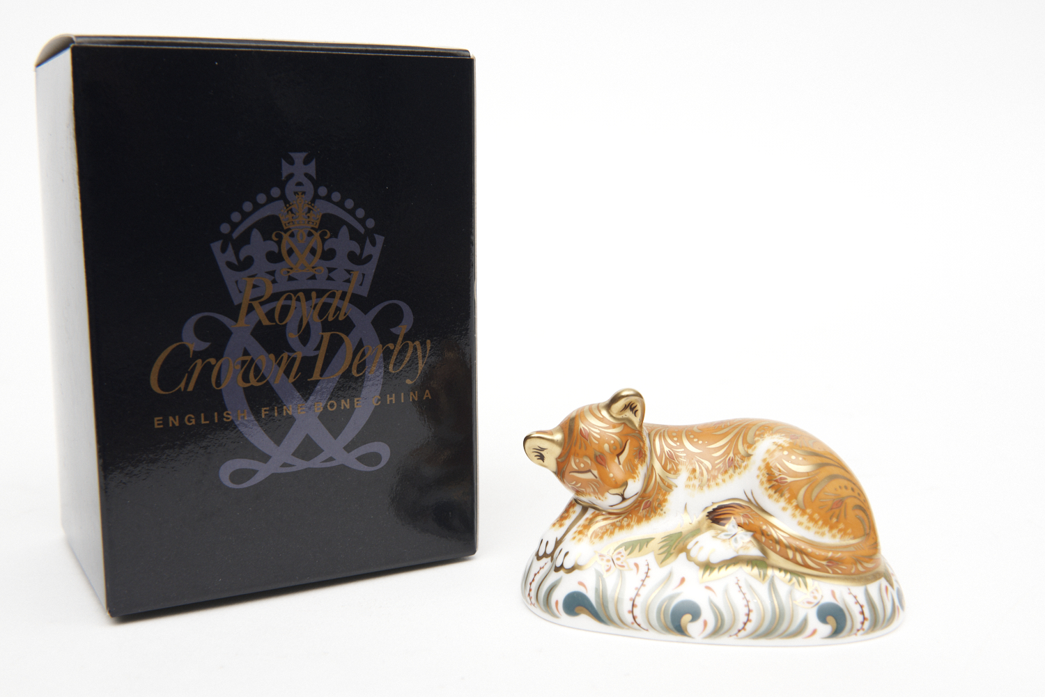 A LIMITED EDITION ROYAL CROWN DERBY SLEEPY LION CUB PAPERWEIGHT, BOXED, WITH CERTIFICATION CARD, NO. 541/950
