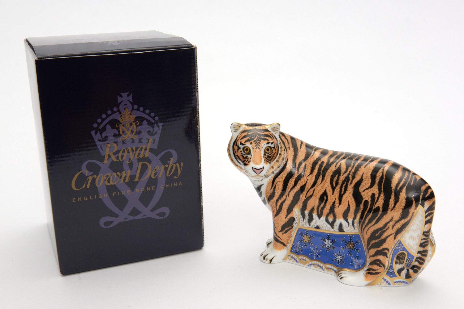 A LIMITED EDITION ROYAL CROWN DERBY SIBERIAN TIGER PAPERWEIGHT, NO 403/750, WITH CERTIFICATION CARD AND BOX, 13 CM HIGH, 17 CM WIDE