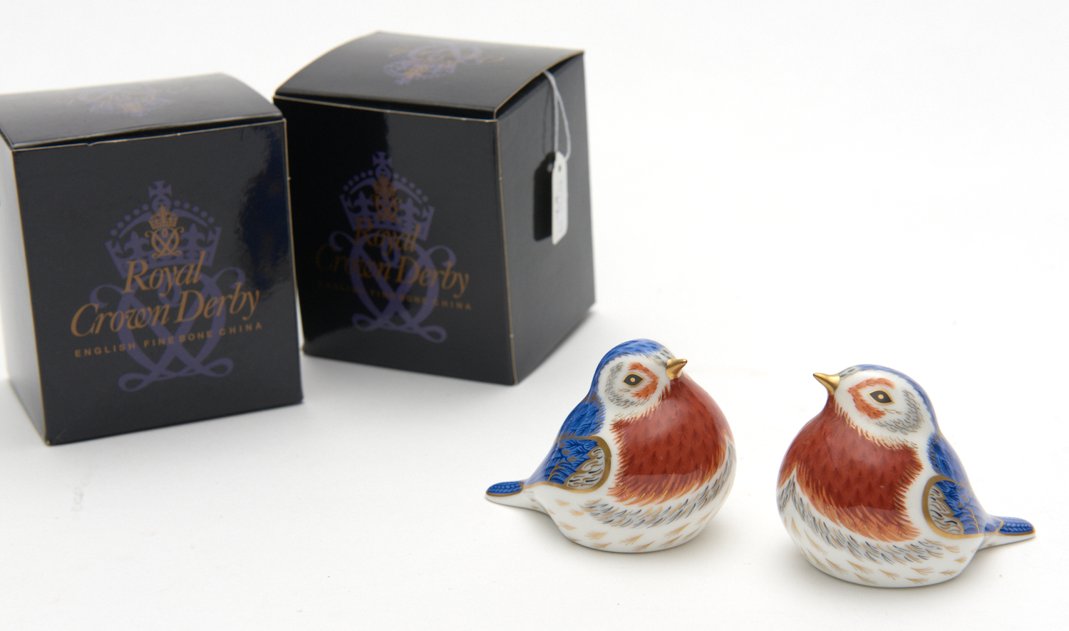 TWO ROYAL CROWN DERBY ANNIVERSARY ROBINS, BOXED, 8 CM HIGH