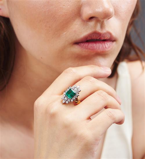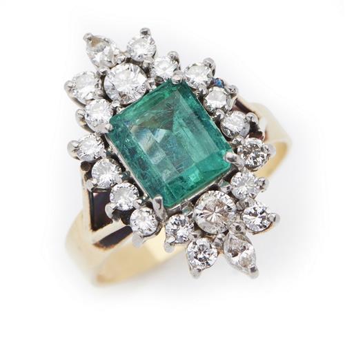 Featuring an emerald cut emerald weighing an estimated 2.13cts, within a surround of round brilliant cut diamonds totalling 1.24cts, in two tone 18ct gold, ring size R.