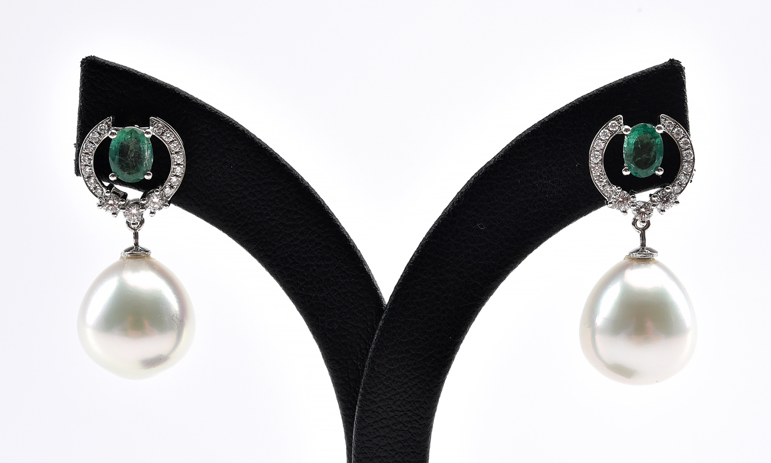Diamonds are good white commercial colour and clarity; emeralds present natural inclusions and a deep gren colour.