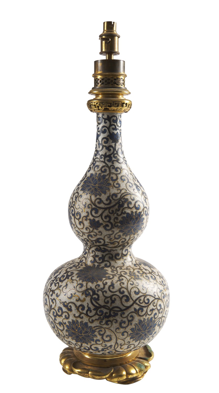 Multiple cloisonne flaws which have been filled with coloured wax at the time of manufacture. Wear to the gilding on the ormolu. Small area of damage to one side with associated cracking o the enamel and small repair with white wax. The vase has been drilled at base. Mouthrim of vase most likely altered in the process of conversion to lamp.