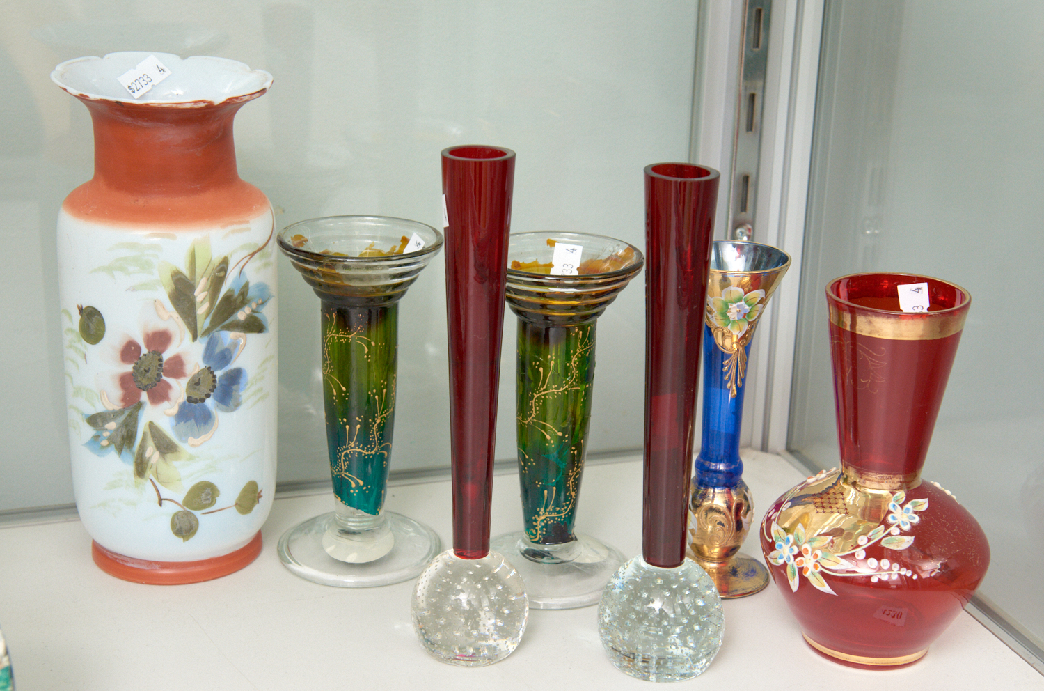 A COLLECTION OF COLOURED AND ENAMELLED GLASS VASES