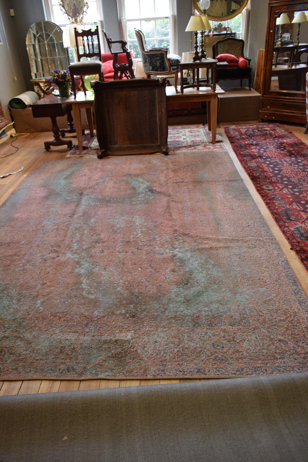A DECORATIVE MODERN OVER-DYED VINTAGE PERSIAN TABRIZ CARPET, VINTAGE PILE. ONE-OF-A-KIND MODERN CARPET CREATED FROM A VINTAGE HAND-KNOTTED PERSIAN TABRIZ CARPET, WITH HAND-CARVED MEDALLION, CORNER MEDALLION AND FLORAL SPRAYS OVER-DYED IN TONES OF PEACH & TURQUOISE. AS SEEN IN BELLE & HOME DÉCOR MAGAZINES. SIZE: 392X287CM ORIGIN: IRAN - RRP: $5,200