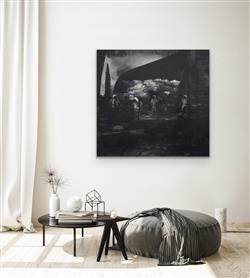 In good condition overall. Light dust has settled on the surface throughout (not damaging). There is a white surface line lower right, approx. 7cm in length. The work is stretched with no additional framing.
