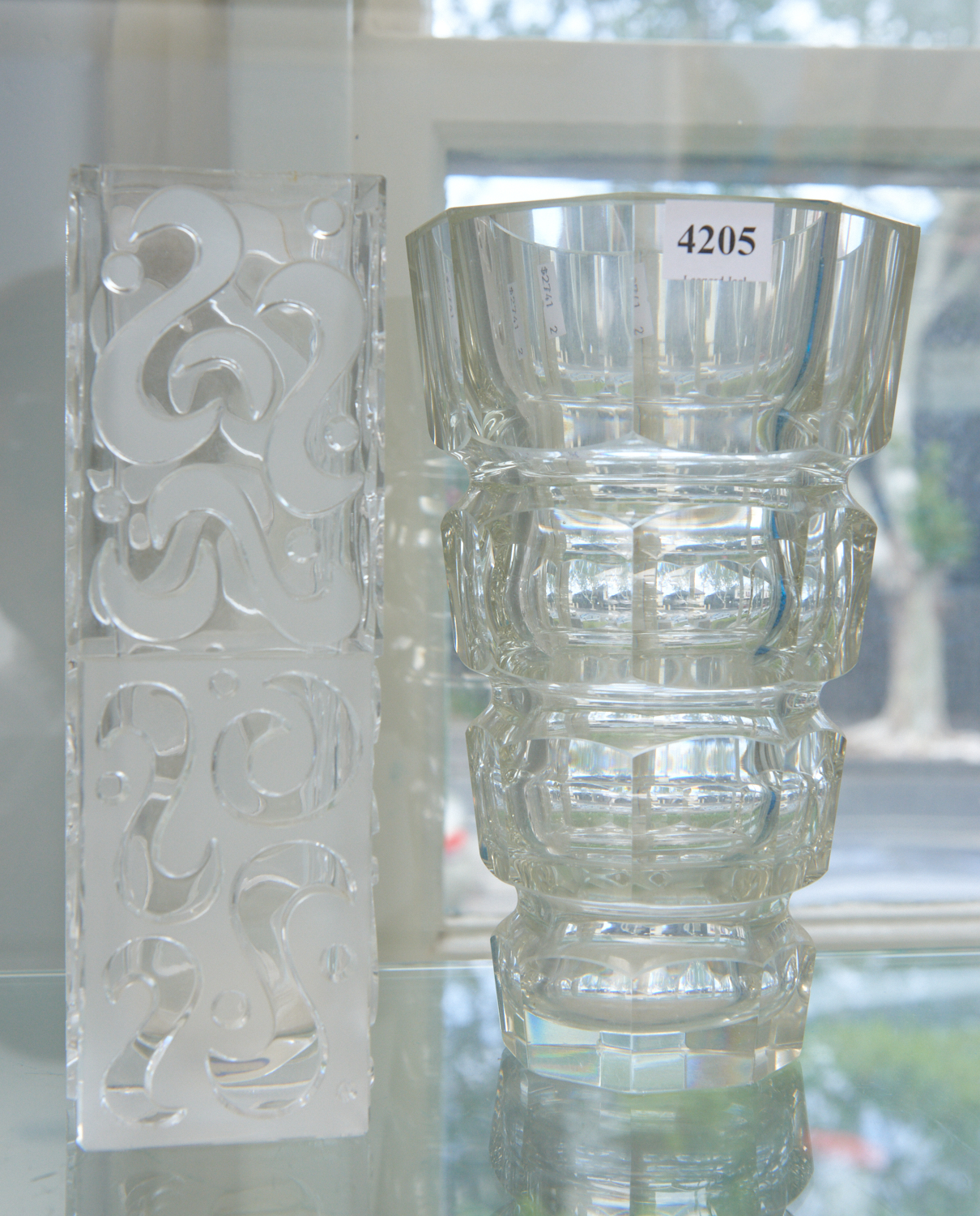 A FLARED FACETED CRYSTAL VASE WITH SECTIONED DESIGN, TOGETHER WITH A RECTANGULAR ETCHED AND CLEAR GLASS VASE WITH A FLORAL MOULDED DESIGN