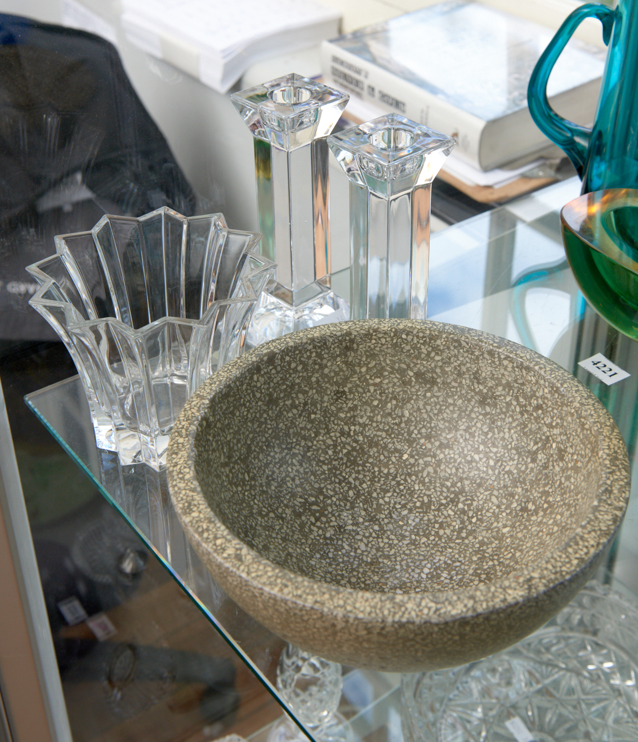 GROUP OF THREE VILLEROY & BOCH ITEMS - CANDLE STICKS, CASE AND GRANITE BOWL