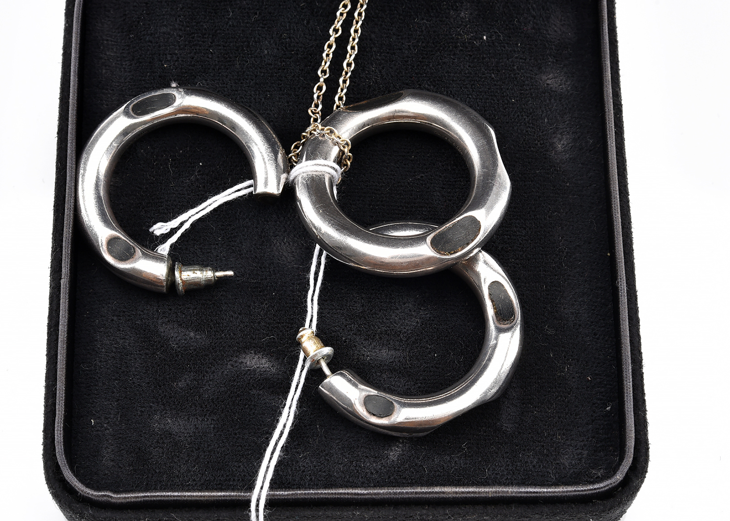 A JEWELLERY SUITE BY FRANK GEHRY FOR TIFFANY & CO., COMPRISING A PAIR OF EARRINGS AND PENDANT IN STERLING SILVER AND EBONY, BOXED