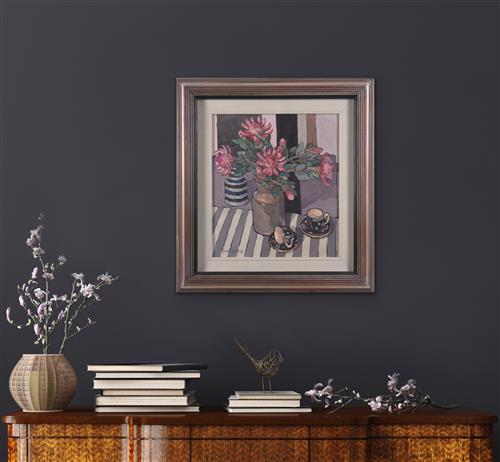 The work is in very good condition with no faults to report. One very small area of paint loss seen in the upper right corner (pinhead sized). Work is well framed in a decorative timber and gold frame. Overall size: 73.5 x 68cm