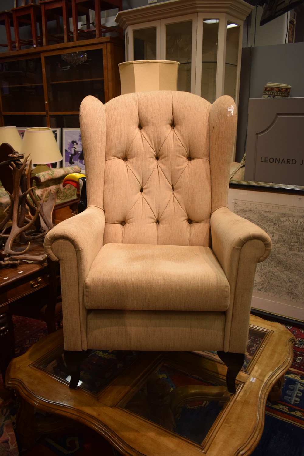 A WARWICK UPHOLSTERED WING BACK ARM CHAIR