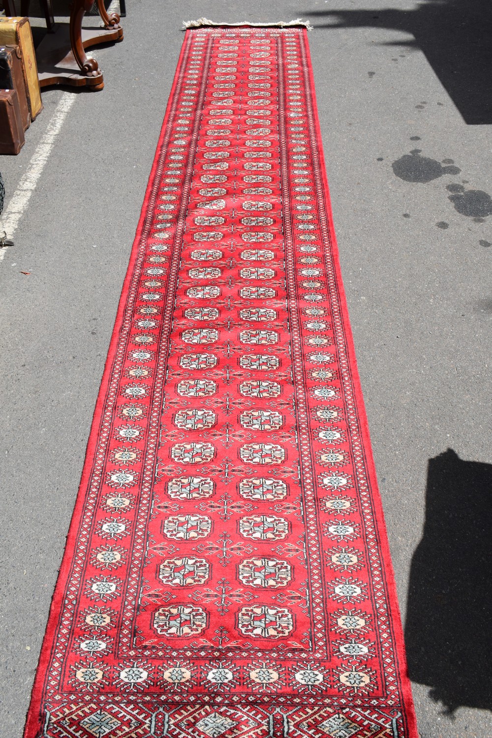 A FINE BOKHARA ELEPHANT FOOT DESIGN RUNNER IN TONES OF RED, 591 X 77CM