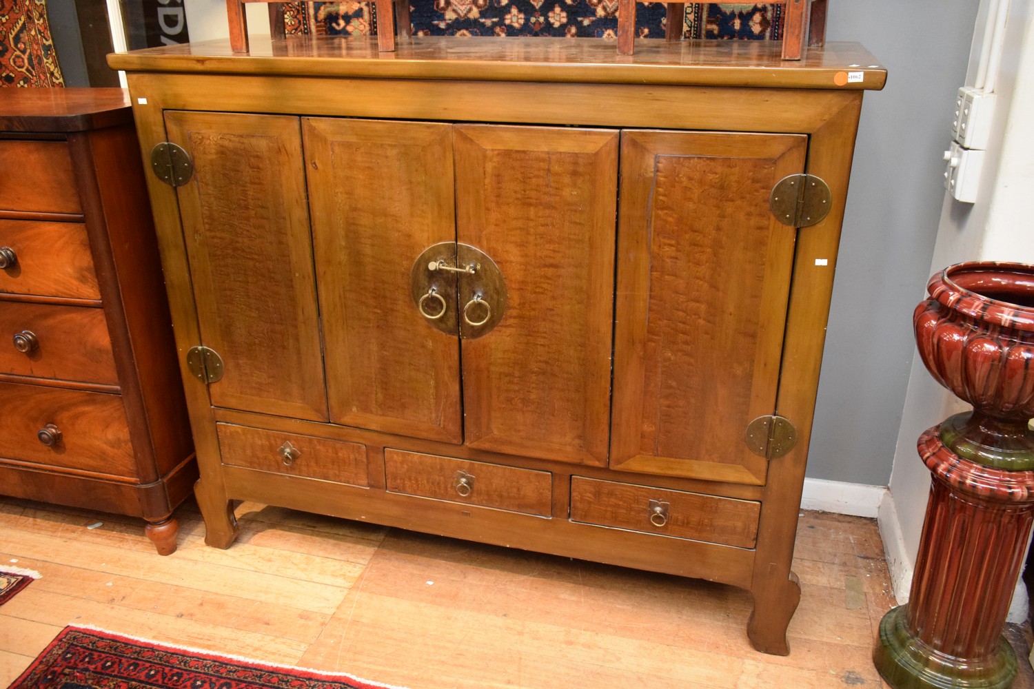 A SUBSTANTIAL CHINESE CABINET WITH THREE DRAWERS (139H x 167W x 63D CM) (PLEASE NOTE THIS ITEM MUST BE REMOVED BY CLIENTS OR CARRIERS AT THE CUSTOMERS EXPENSE)