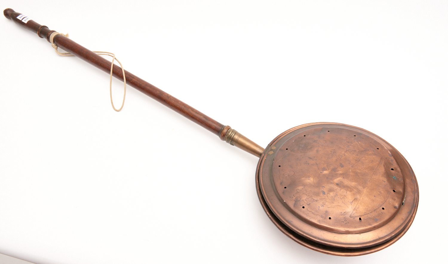 A VICTORIAN COPPER AND WOOD HANDLED WARMING PAN