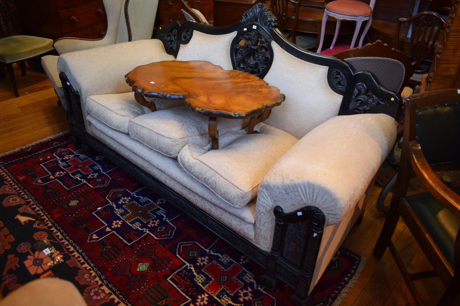 A VERY LARGE THREE SEATER CHINESE STYLE SOFA (PLEASE NOTE THIS ITEM MUST BE REMOVED BY CLIENTS OR CARRIERS AT THE CUSTOMERS EXPENSE)