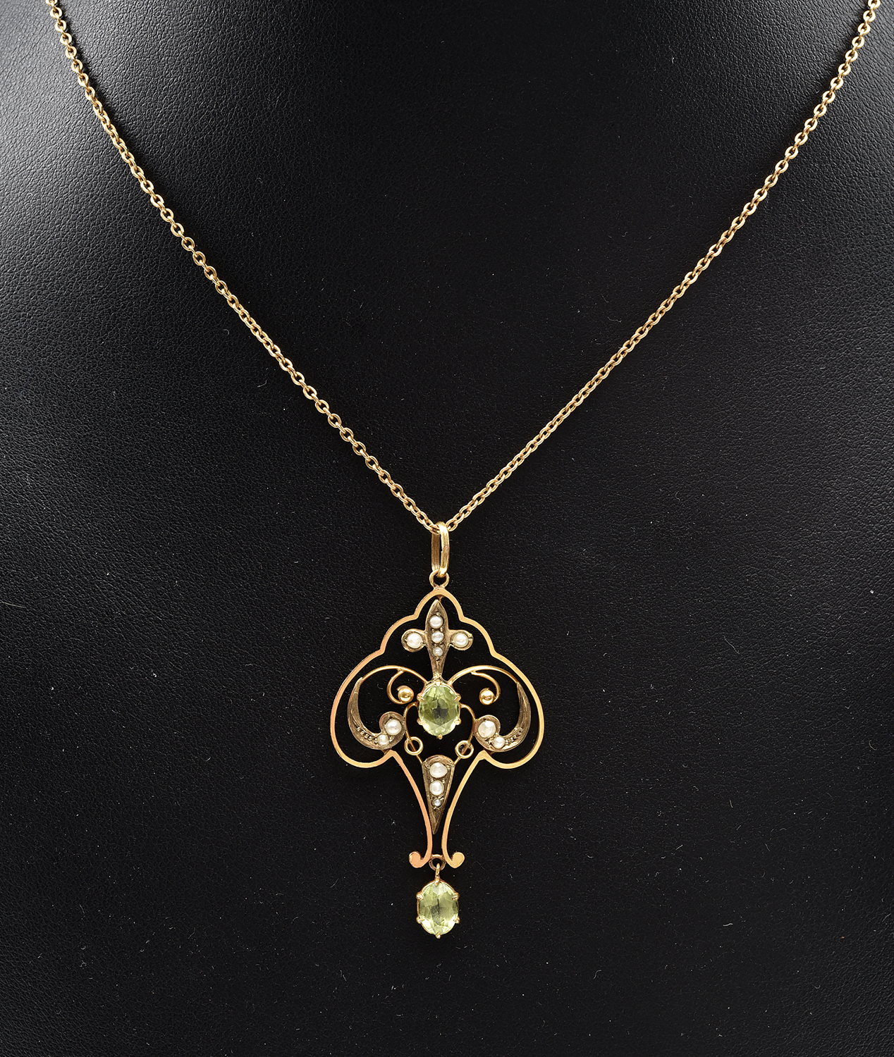 AN EDWARDIAN SEED PEARL AND PERIDOT PENDANT NECKLACE IN 9CT GOLD