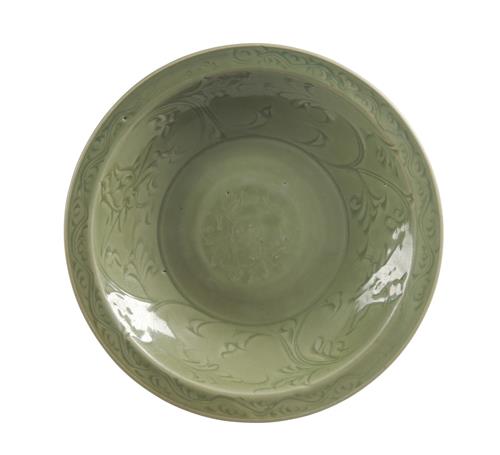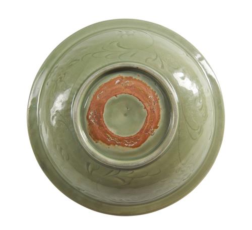 Decorated with an impressed peony surrounded by carved scrolling foliage and flowers, covered in an even celadon glaze. Unglazed ring within the footrim with remnant cylindrical pontil mark.