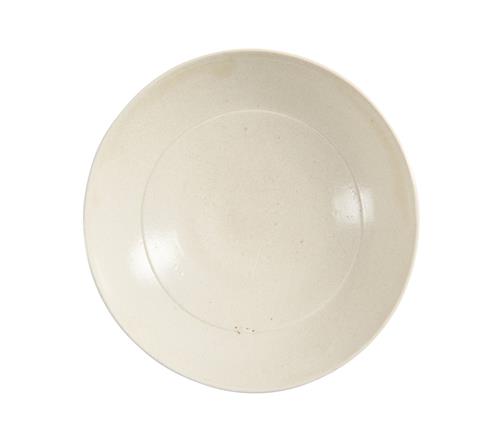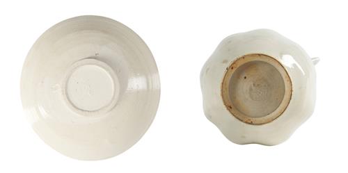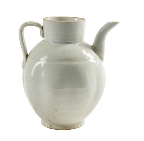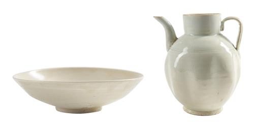 The bluish glazed ewer of lobed ovoid form with an s-shaped spout and a strap handle, the dish with a greyish coloured glaze.