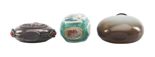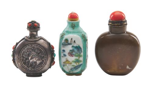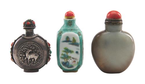 Comprising a hardstone embellished silver bottle, a brown and white jade bottle with coral stopper and a famille rose bottle with coral stopper.