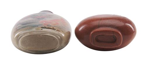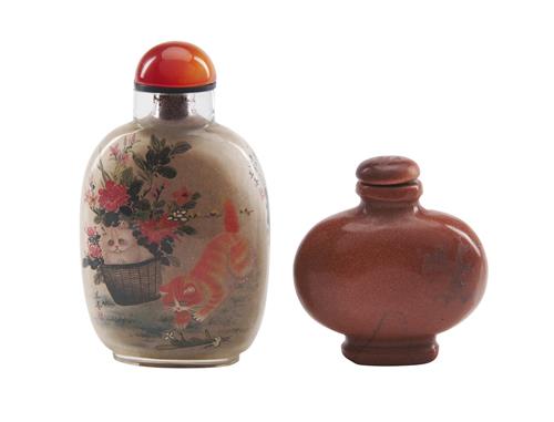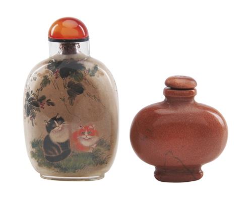Comprising one snuff bottle of inside painted glass featuring cats, the other of goldstone glass.